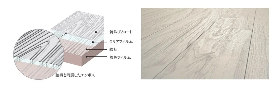 エンボス手法で質感を付与しているため、 家庭用フローリングワックスを使用した際も、天然素材のようなリアルな質感が損なわれにくくなっている。