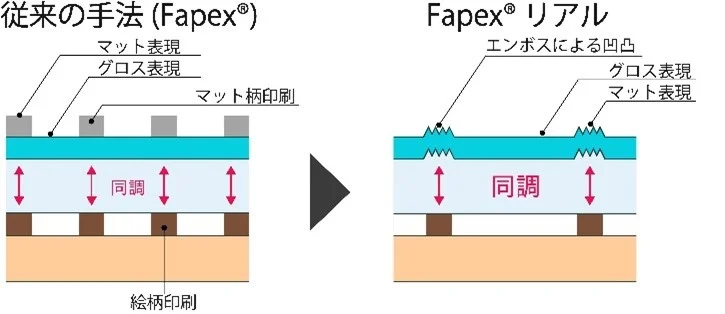 木目などの天然素材を表現した化粧シートにおいては、近年絵柄としてのリアルさだけでなく、その質感の再現が求められている。しかしながら、従来の表面コーティングによるテクスチャー表現(グロスマット)では、繰り返しの摩擦による摩耗を完全に抑えることが難しく、床用途への展開ができなかった。