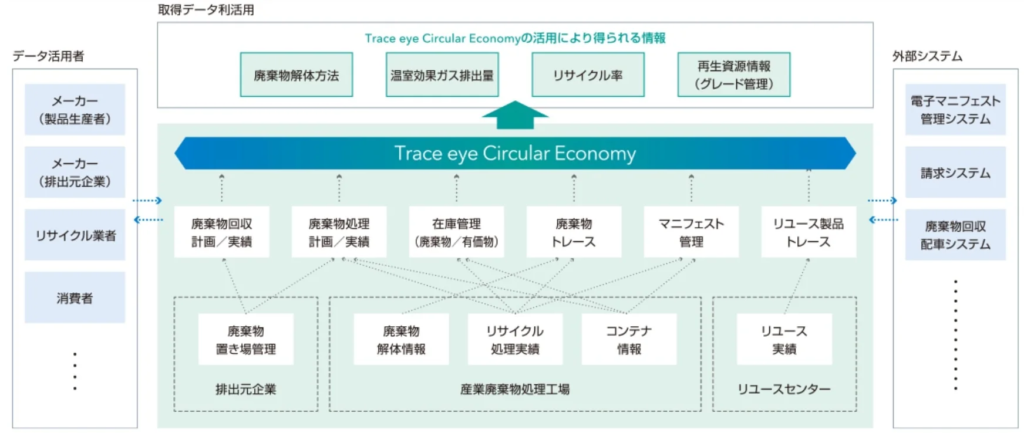 Trace eye(R) Circular Economyは、資源循環を支えるトレーサビリティソリューション。産業廃棄物の回収・運搬、入荷・選別、解体・選別、処理、出荷まで一連のプロセスを可視化しデジタル管理を可能にする。