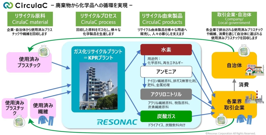 KPRを通じて、使用済みプラスチックなどを高温でガス化して分子レベルまで分解し、水素と炭酸ガスを取り出している。水素は、川崎市のホテルに設置された燃料電池の発電用として使われるなどのほか、社内でアンモニアの原料として利用している。アンモニアは、川崎事業所でアクリロニトリルの原料として用いているほか、外販先で合成繊維や化学肥料、脱硝用薬剤などに使われる。一方の炭酸ガスは、大気中に放出することなくレゾナックのグループ会社でドライアイスや炭酸飲料などの原料として利用される。これらは、今後CirculaCブランド製品として販売する予定。