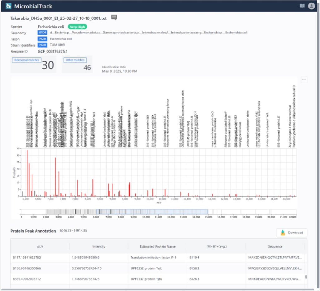 「MicrobialTrack」で活用する原核微生物タンパク質理論質量データベース「GPMsDB」は、業界最大となる8万5千種の微生物の理論質量が搭載されている。MALDI-TOFMSにより検出されるタンパク質の実測質量と、「GPMsDB」の理論質量を比較して、類似度に基づいて微生物を同定する。
