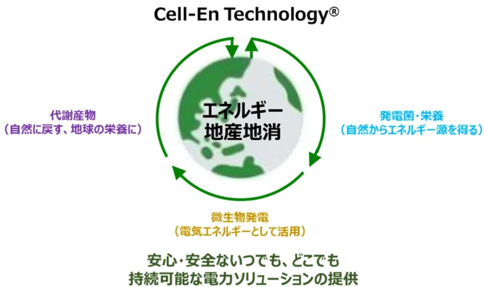 Cell-Enの微生物発電技術であるCell-En Technology(R)は、発電コアを固相化することにより発電量を上げることに成功した独自のテクノロジー(特許)。発電する微生物は各地域において独自に単離したものを利用し、栄養分も食品廃棄物/農業廃棄物を活用することにより、廃棄物のアップサイクルを可能とする。Cell-En Technology(R)はエネルギーの地産地消を実現し、エネルギー問題と廃棄物問題の社会課題の解決を目指している。