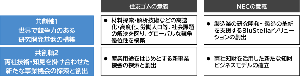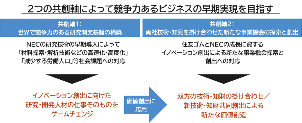 近年、グローバル競争の激化や労働人口の減少が進む中、持続的な競争優位性の確保に向けて、研究開発活動の高度化・高速化が一層重要となっている。住友ゴムとNECは、2022年にタイヤ開発における匠(熟練設計者)のノウハウをAI化し技能伝承と技術開発体制を強化する取り組みを実施するなど(注1)、従来から共創活動に取り組んできた。