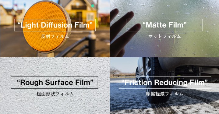 エンボス加工で凹凸を付与することで、光拡散・艶消し・マットフィルムを作成できる。マット・梨地柄だけで10種類以上を取り揃えており、要望に応じて表面粗さや深度の調整も対応。マットフィルムにエンボス加工を行い、さらに粗くすることも可能。
