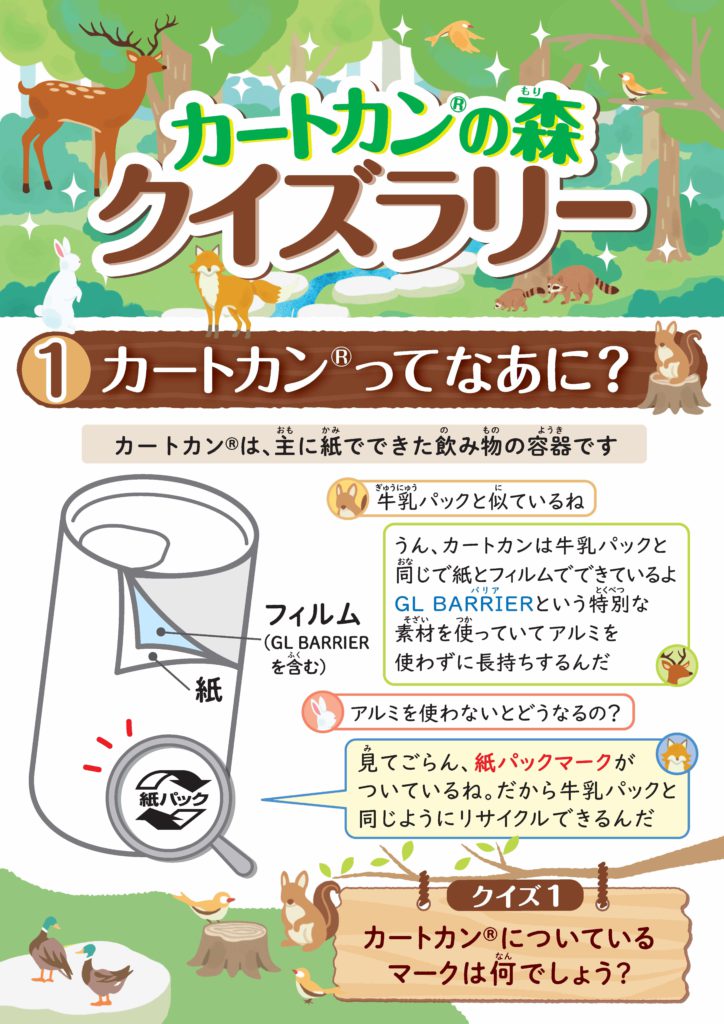 TOPPANが提供する紙製飲料容器「カートカン®」に関するクイズラリーを実施。ブース内に設置された3つのクイズ台で、参加者に正解を選択し、木を模した「カートカン®」をクイズ台の穴へ投入し、正解の場合は「カートカン®」が出てくる仕組みになっている。楽しみながら「カートカン®」の特徴や環境への取り組みについて学ぶことができる。さらに、クイズラリー参加者に、TOPPANが販売している「カートカン®」の天然水をプレゼントする。