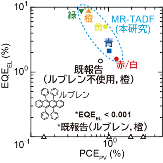 有機半導体は、薄く、軽く、柔軟であるという優れた特性に加え、多彩な光機能を持つため、次世代の電子デバイスとして活発に研究されている。実際に、高い発光効率を活かした「有機EL(OLED)」はスマートフォンなどのディスプレイとして広く普及し、一方で高い吸光度を活かした「有機薄膜太陽電池(OPV)」の開発も進められている。 しかし、これら「発光」と「発電」という2つの機能を1つのデバイスに統合しようとすると、深刻な効率低下の問題に直面してきた。 これまでの研究では、光吸収に優れた「ルブレン」が光吸収・発光材料に用いられていた。この場合、電力変換効率(PCEPV、発電効率)は最大約3%が得られるが、EL発光の外部量子効率(EQEEL)はわずか0.001%以下であった(図2:黒△)(参考文献1)。ルブレンを用いた素子ではEQEELの抜本的な向上が困難であるため、ルブレン不使用の素子も報告されているがPCEPV/EQEELはともに1%程度が最大であった(図2:黒〇)(参考文献2)。また、これまでは動作する色が橙色などの長波長領域に限られており、フルカラー化が困難である点も応用への大きな障壁となっていた。