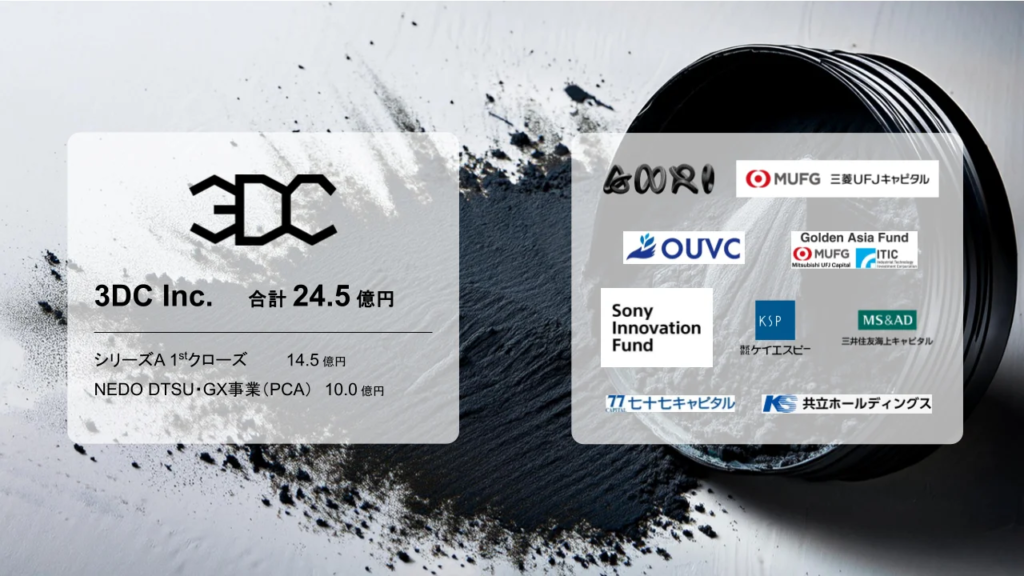 3DCは、シリーズAラウンド 1stクローズ、並びに、NEDO(新エネルギー・産業技術総合開発機構)の「ディープテック・スタートアップ支援基金/ディープテック・スタートアップ支援事業」(DTSU事業)のPCAフェーズ(実証化研究開発(後期))に採択され、合計で24.5億円の資金を調達した。これにより3DCは、日本で発明された次世代炭素材料であるGraphene MesoSponge(R)(GMS)の、世界で初めての量産工場の着工を開始する。GMSは主にリチウムイオン電池向けの機能性導電助剤として販売される予定で、材料供給規模はリチウムイオン電池の容量換算でおよそ3GWhとなる。