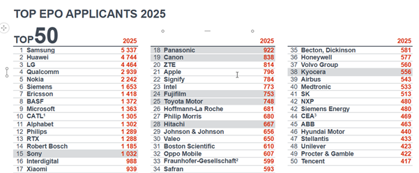 ソニー・パナソニック・キヤノンを筆頭に、グローバルなEPO出願上位企業に日本企業が複数ランクイン