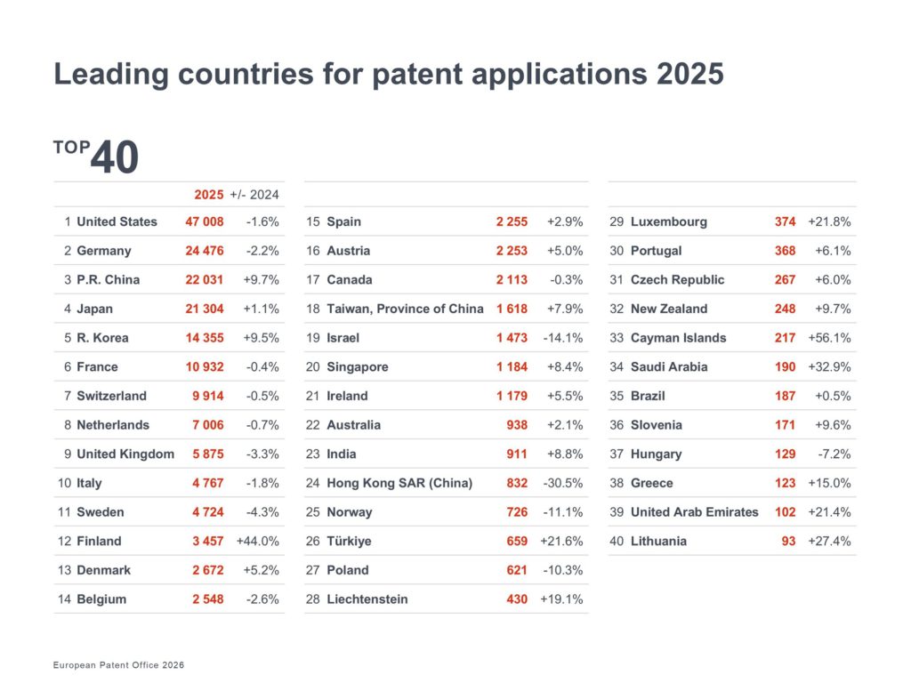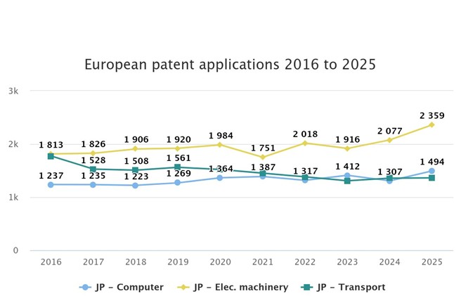 2025年における欧州への特許出願国の首位は米国(-1.6%)を維持し、ドイツ(-2.2%)、中国(+9.7%)、日本(+1.1%)、韓国(+9.5%)が続いた。日本は2025年に成長を記録した上位10カ国のうちわずか3カ国の1つであり、数年にわたる安定・低下傾向からの転換となった。 中国が2016年以来の出願数を3倍に伸ばし、初めて日本を上回って第3位に浮上した一方、日本のイノベーターは幅広い戦略的技術分野にわたって特許出願件数を増加させた。