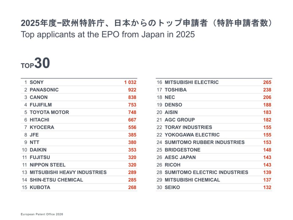 2025年の日本のEPO出願上位企業は、ソニーグループ(1032件)が首位となり、パナソニック(922件)、キヤノン(838件)、富士フイルム(753件)、トヨタ自動車(748件)が続き、電子機器・映像・自動車技術にわたる日本の多様なイノベーション基盤を反映している。グローバルでは、サムスン、ファーウェイ、LGが上位3位を占めた。EPOトップ40に入った日本企業は7社となり、2024年の6社から増加しました。最も大きな伸びを示したのはトヨタ自動車で、2024年の第43位から2025年には第25位へと躍進。京セラ、富士フイルム、キヤノンも出願件数を大幅に増加させた。