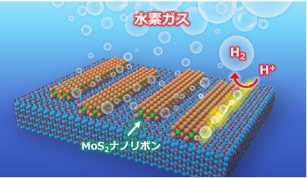 ▶クリーンエネルギーの観点から水素発生触媒が必要とされているが、白金触媒は高価なため、代替となる触媒の候補として二硫化モリブデン(MoS2)が期待されている。