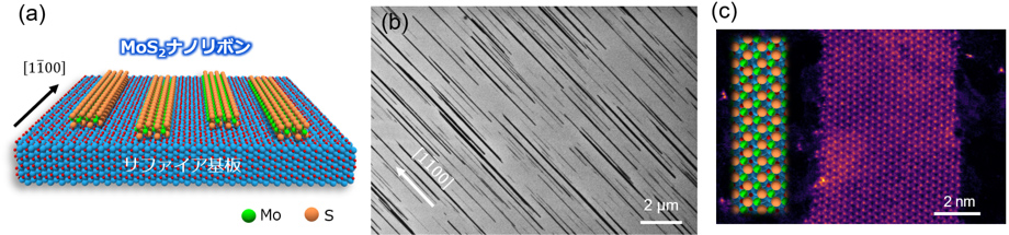 本研究では、原子の並びが向きによって異なる(異方的な)表面原子配列を有するサファイアのa面を用い、かつ合成条件を詳細に検討することで、一方向に配列した高密度のMoS2ナノリボンを合成することに成功した。具体的には、酸化モリブデン(MoO3)と硫黄(S)を原料として使用し、アルゴンガスを流しながら1100℃のサファイア基板上で化学蒸着法(CVD法)(※3)によりMoS2ナノリボンを合成した。図1(a)と(b)にその原子モデルと実際の走査型電子顕微鏡(SEM)写真を示す。サファイア基板上に数十nmから数百nmの幅をもつMoS2ナノリボンが特定の方向にきれいに向きを揃えて高密度に成長しているのが分かる。ナノリボンの高さ測定や分光測定などから、このナノリボンは単層MoS2(S-Mo-Sの原子3個分の厚み)であることを確認している。このようなMoS2の一方向成長は、サファイア表面の異方的な原子配列による影響を受けて起こったものと考えている。