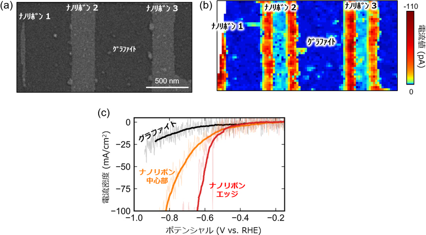 次に、この配向したMoS2ナノリボンを導電性のグラファイト基板の上に転写し、電気化学的な触媒活性を測定した。この際、電解液を充填した先端が非常に細いガラス管(ピペット)を用いた走査型電気化学セル顕微鏡(SECCM)(※4)を利用して、水素発生反応(HER)の触媒活性サイトの可視化を試みた。図2(a)に示す3本のナノリボンに対して測定を行った結果が図2(b)。水素発生は還元反応であり、電流値が高いほど反応が活発に起こる、つまり水素発生が多く起こっていることを示す。図2(b)から明らかにMoS2ナノリボンのエッジの触媒活性が高いことが分かる。電流値の詳しい解析の結果、ナノリボンの中心部に対して、エッジでは100倍近い活性を示していた。さらに、細いリボン(図2(a),(b)のナノリボン1)ではエッジ/面積比が大きく、単位面積当たりのHER活性が高いことが明らかとなった。図2(c)はエッジと中心部、そしてグラファイト表面を比較したものだが、エッジが最も反応が起こる電圧(過電圧)が低い、つまりHERを起こしやすいことを表している。以上の結果は、エッジの割合が高いナノリボンが水素発生に適していることを示している。このように、本研究で実現した高密度の配向MoS2ナノリボンとSECCMという高度な測定法の組み合わせによって、水素発生触媒の設計と作製に関する重要な指針を得ることができた。