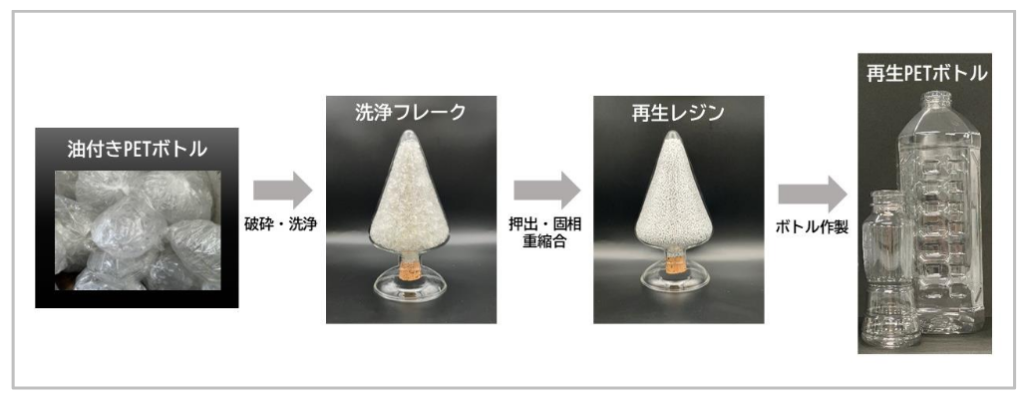 長年油に向き合ってきた知見と技術検証を重ねた結果、特定の資源循環スキームにおいて、油付き PET ボトルの水平リサイクルが可能であることを技術的に実証した。
