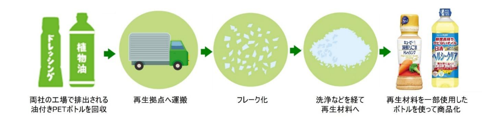 今回は、日清オイリオおよびキユーピーの製造工場にて排出された油付きPETボトルを回収し再生材料を使った。その再生材料を一部使用して新しいPETボトルを作り、再び商品として届けすることで、確実な資源循環の第一歩を踏み出す。