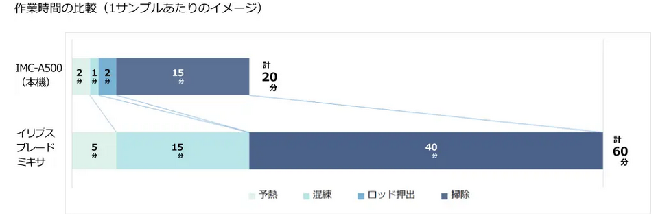 - トータル作業時間を1/3に短縮: 従来は約15分かかっていた混練をわずか1〜2分で完了。さらに、独自の遠心力によるサンプル排出機能により、面倒な清掃作業も大幅に簡素化した。