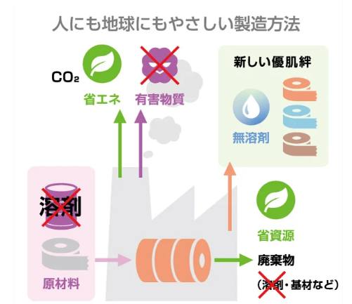 この度発売される製品は、「テープをはがす際に肌の角質をはがしにくく、肌に優しい」という特長はそのままに、人にも地球にも優しくなった、新しい『優肌絆』。新開発の環境配慮型ゲル粘着剤は、製造工程において有機溶剤(VOC の原因物質)を使用せず、水をベースとした製法を採用している。有機溶剤を使用しないことから、人体に影響を及ぼす有害物質が製造工程で発生せず、CO 2 排出量も削減できるため、環境負荷の低減に貢献する。