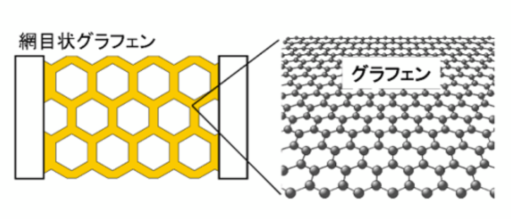 グラフェンは、炭素原子が蜂の巣状に結合したシート。鉛筆の芯にも使われているグラファイト(黒鉛)は、グラフェンが層状に積層したもの。原子ひとつ分の厚さしかないので極限的に薄く軽量であることに加え、非常に高い強度と柔軟性を持つ。