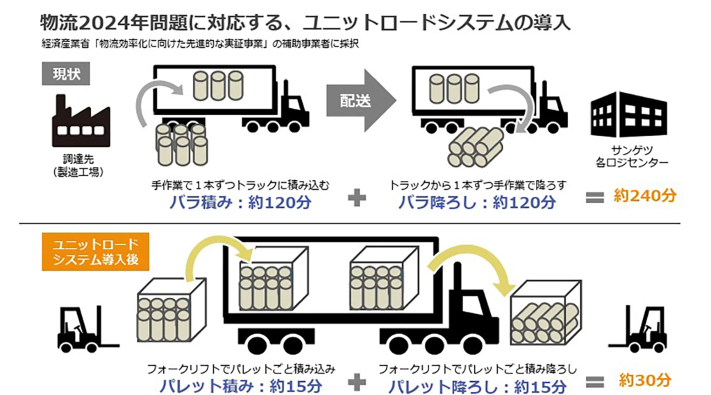 サンゲツが内装材の主力商品として取り扱う壁紙は、調達先のメーカーより約50mの巻き物状の荷姿で入荷され、その長辺は約90cm、重量は約20kgに及ぶ。従来の調達物流において、メーカーでのトラックへの積み込みと、サンゲツのロジスティクスセンター(LC)での積み降ろしは、ドライバーの手で1本ずつ「バラ積み・バラ降ろし」が行われ、その作業には1運行当たり約240分もの時間を要していた。また、巻き物状の壁紙を輸送時には縦積み、入庫時には横積みにするなど、人力での作業負荷も高い状況であった。