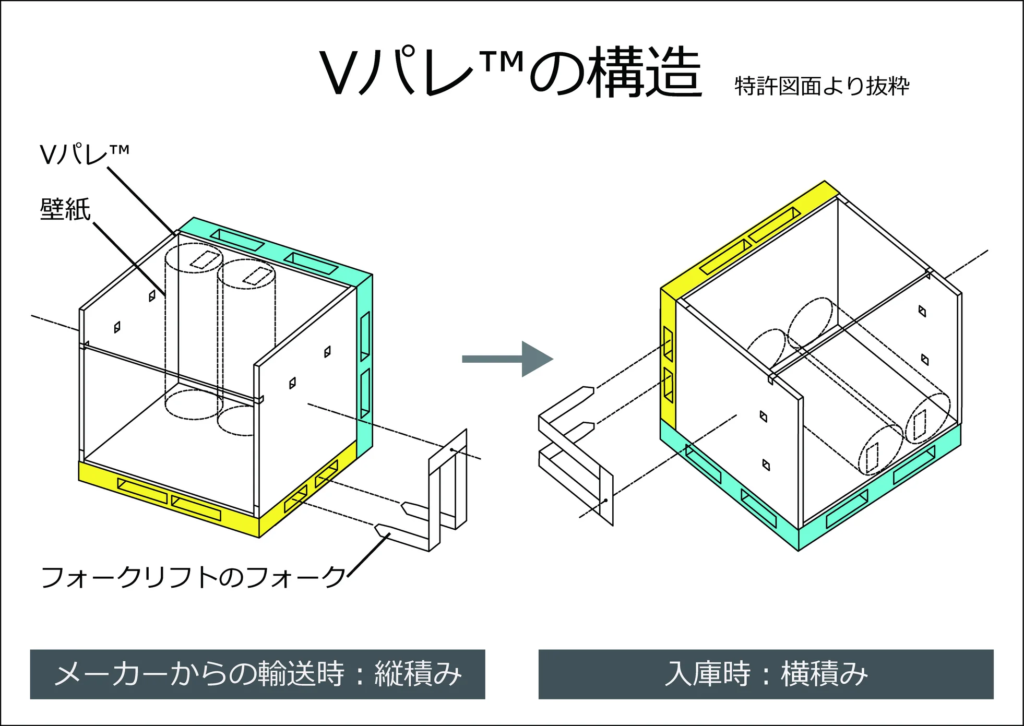 サンゲツは、ユニットロードシステムのコア技術である回転式パレット「VパレTM」の構造について、3件の特許を取得した。この回転式パレットは、同社ロジスティクス部門の社員が「搬送時と保管時における商品の積み方を変えられるパレット構造」というアイデアを考案したことが導入のきっかけとなった。2つの底面にフォークリフトのフォーク挿入孔を備えた設計により、「パレット積み・パレット降ろし」を実現し、効率的かつ安全な物流システムを構築する。なお、これら3件の特許は補完関係にあり、サンゲツは今後も知的財産に関して強固なポートフォリオを築いていく。