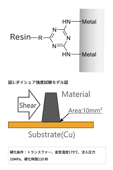 銅基板との密着性評価として、フェノール樹脂成形材料を用いたダイシェア強度試験では、汎用フェノール樹脂の代わりに金属密着用フェノール樹脂「PR-56464」を配合することで、密着強度が大幅に向上した。また、試験後の破壊モードを比較すると、「PR-56464」配合材料では凝集破壊が観察されており、このことからも接着強度の向上が確認できる。