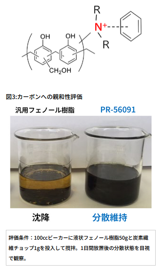 同社のカーボン密着用「スミライトレジン PR-56091」および「スミライトレジン AQNOA PR-56542」は、カチオンπ相互作用によりカーボン素材との親和性を高めたフェノール樹脂。これらをカーボン系複合材料のバインダーとして使用することで、カーボン素材との親和性が向上し、密着性や耐久性が改善する。また、フェノール樹脂は合成樹脂の中で極めて高い炭化収率を有しているため、炭化焼成させることによって、カーボンバインダーとしても機能を発揮する。