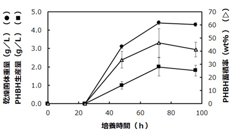 しょうゆ油を原料として典型的なPHAであるP(3HB)のみならず、加工性の高いPHAであるP(3HB-co-3HHx) (以下、PHBHと略)をPHA合成菌の遺伝子組換え株を用いて合成できた。PHBHは、可塑性や熱安定性が高い特性を持ち、典型的なPHAに比較して加工し易い特徴がある。