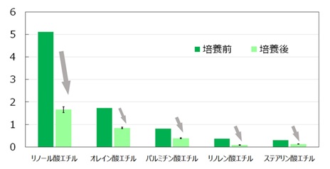 しょうゆ油を分析したところ、リノール酸エチル、オレイン酸エチル、パルミチン酸エチル、リノレン酸エチル、ステアリン酸エチルが含まれていた。PHA合成する前の培養前と、PHA合成が終了した培養後の各脂肪酸エチルエステル量を比較した。結果としては、すべての脂肪酸エチルエステルが減少していることが分かった。よって、しょうゆ油を用いたPHAの微生物生合成においては、脂肪酸エチルエステルが生合成に寄与していることが明らかとなった。