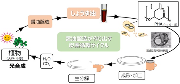 今回の研究成果に基づいた炭素循環サイクルについての概略は下記の通り。植物(大豆、小麦)を主原料とした醤油醸造より得られる副産物として、しょうゆ油がある。しょうゆ油は、微生物を用いたオールバイオプロセスを経て、生分解性バイオプラスチックへと生まれ変わる。これを原料として生分解性プラスチックが成形・加工され流通される。基本的にはリサイクル回収できることが望ましいが、一部環境中に放置されてしまったとしても、生分解する性質があることから、環境中の微生物によって水と二酸化炭素へ変換される。植物がこれらを用いて光合成することで、再び大豆や小麦が生産される、というサイクルが考えられる。