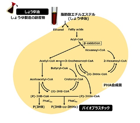 生分解性プラスチックには様々な合成方法がある。今回の研究では、微生物培養法を用いた生合成を研究した。従来、植物油脂(大豆油やパーム油)を用いたPHAの生合成としては、トリグリセライド(中性脂肪)が主要成分と言われてきた。今回の研究成果から、しょうゆ油に含まれる主要成分である『脂肪酸エチルエステル』をPHA合成菌(微生物)が代謝して、生分解性バイオプラスチックであるP(3HB)や、P(3HB-co-3HHx)が合成されると推測される。今回の研究によって、脂肪酸エチルエステルが主要成分である油脂を用いてPHAが合成されることが、初めて明らかになった。