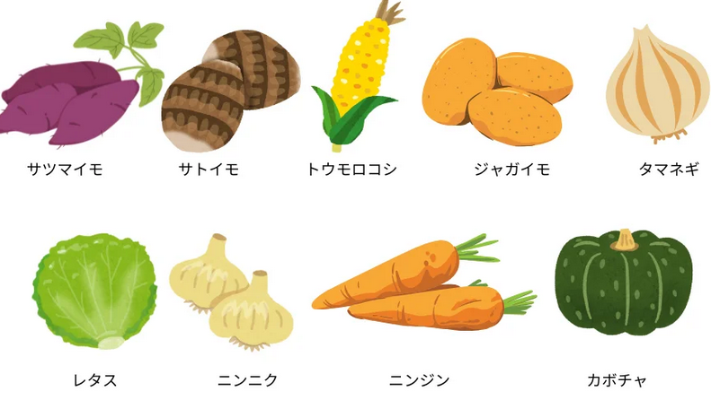 サツマイモ、サトイモ、トウモロコシ、ジャガイモ、タマネギ、レタス、ニンニクのほか、ニンジン、カボチャについても問い合せがある。
