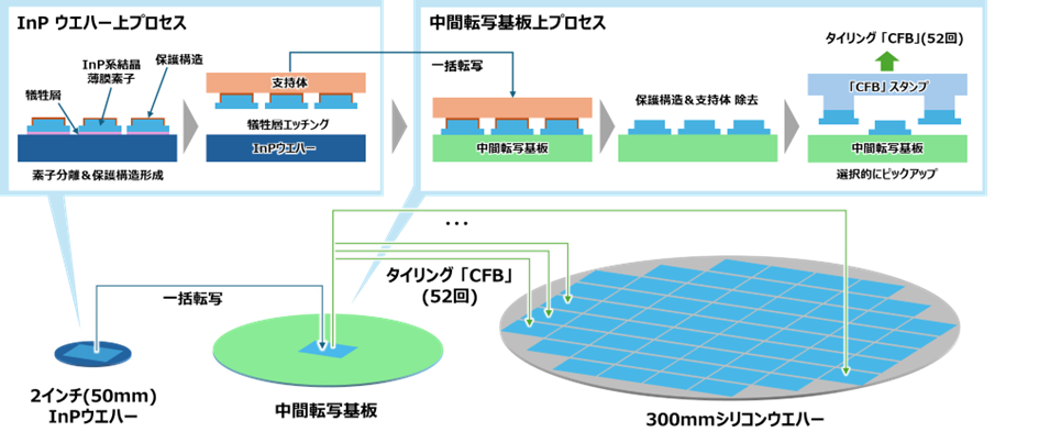 今回、2インチから300mmシリコンウエハーへのタイリング「CFB」技術を実証した。本技術は3インチや4インチのInPウエハー、200mmシリコンウエハーなどにも柔軟に対応可能である。また、既存の光半導体製品にも応用でき、高放熱基板への転写による性能向上や、大口径化による生産性向上にも寄与する。