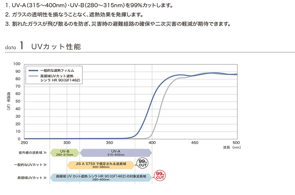 紫外線の波長280~400nm※(UV-A・UV-B)に効果を発揮する、高領域UVカット遮熱フィルム「シンラ HR 90」を開発。従来のUVカットフィルムより幅広い波長域の紫外線をブロックするため、肌の日焼けや家具の退色を防ぐ効果が期待できる。そのほか、窓の防犯対策としてCPマークを取得した防犯フィルム「フォルティス 90」を新たに収録。高い衝撃耐久性があるため、ガラス破りによる侵入の抑制が期待できる。