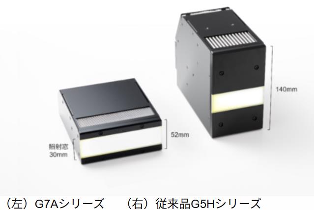 従来の高出力品であるG5Hシリーズと比較して、製品の設置面積を62%削減、高さを10%低減したことで、同じ光学性能を持つ製品において世界最小クラスのサイズ(120×52×151mm)を実現。照射窓サイズは30mmを確保し、高い硬化性能を維持しながら省スペース化に貢献する。