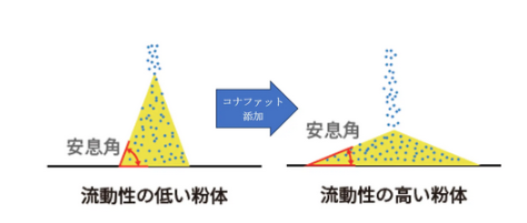 流動性の低い粉体にコナファットを添加すると流動性が向上する。これにより品質の改良だけでなく、製造工程における作業性向上にもつながる。例えば、流動性が向上することで、粉体原料を貯蔵管理するホッパー内での粉詰まりを抑制し、ブリッジ(製造工程内での粉体の固化)を防ぐことで、製造時のトラブル低減にもつながる。