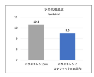 オレフィン系樹脂フイルムにコナファットを添加すると水蒸気を通しにくくなり、樹脂フイルムの水蒸気バリア性を向上させることができる。