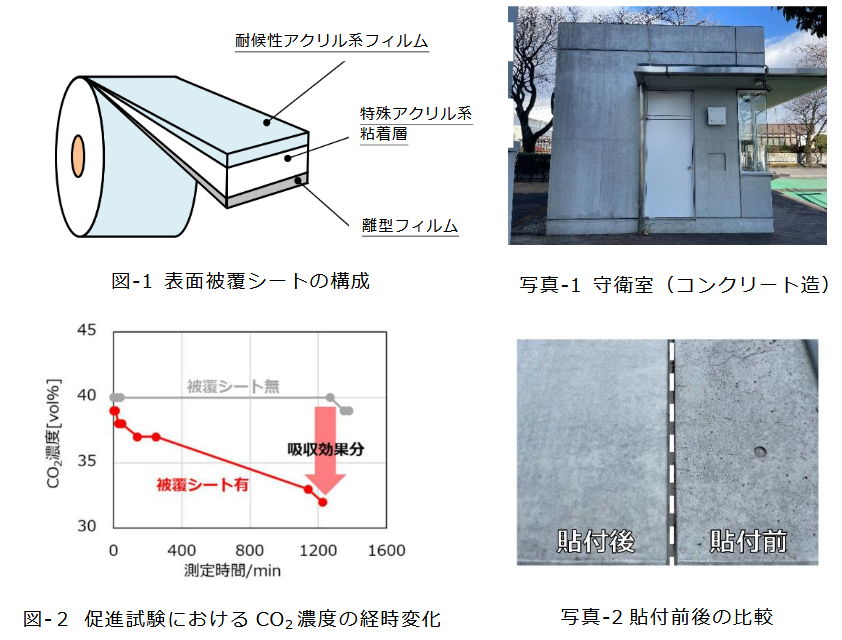 同シートは粘着層にCO2の吸収性能を有する材料を使用している。密閉した空間に同シートを静置してCO2濃度の経時変化を確認する促進試験を行った(図-2)(※1)。その結果によれば、同シートは施工後10〜20年程度にわたって吸収効果が継続することが見込まれる。