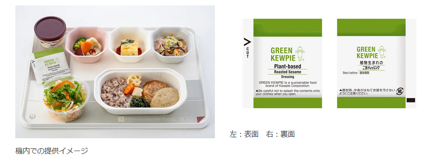 キユーピーとJALグループの商社 JALUXの両社が共同で企画開発した国内初[※1]となる紙製小袋ドレッシングが、9月20日より日本航空の一部の国際線機内食で提供される。採用されたのは、キユーピーのサステナブルな食を提案する「GREEN KEWPIE」ブランドの「植物生まれのごまドレッシング」。