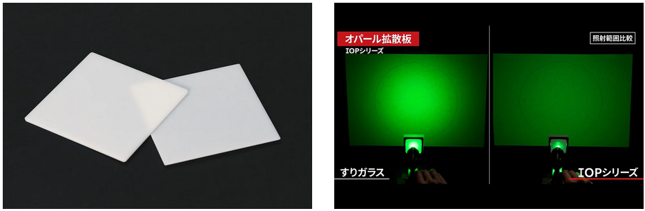 一般的な「すりガラス」と比べて高い拡散性能を備えており、照明用途や分析機器、検査装置など拡散光が必要とされるシーンにおいて、光の均一化に適した材料。