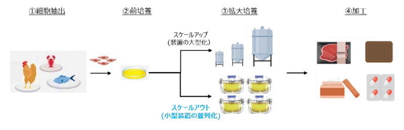 細胞性食品の生産においては、培養装置を大型化して生産量を増やす「スケールアップ方式」が多く採用されているが、同取り組みでは「スケールアウト方式」を採用する。これは、小型の装置を多数並列化することで生産量を増やす手法で、住友理工の細胞培養バッグは、一般的な理化学実験室に設置されている汎用設備で培養が可能なため、初期投資の大幅な削減と迅速な立ち上げを実現する。また、バッグ数量の増減により生産量をフレキシブルに調整できるため、市場の成長に合わせた段階的な生産量の拡張が容易。さらに、バッグ単位の独立運転によってトラブル発生時のリスクを分散し、安定的な供給体制を構築する。