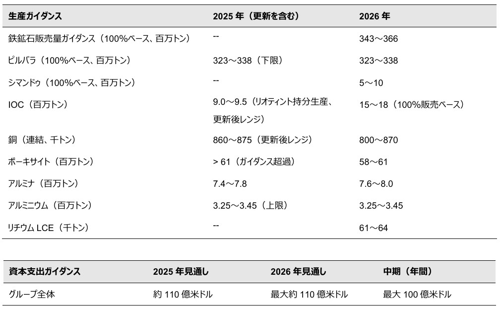 • 中期の資本支出ガイダンス(2028年以降)は100億ドル未満に回帰する。これは、オユトルゴイ坑内掘り(銅)、シマンドゥ(鉄鉱石)、リチウム(主にリンコン)プロジェクトが完了し、ピルバラ(鉄鉱石)とアムラン(ボーキサイト)での代替プロジェクトが実行されるため。