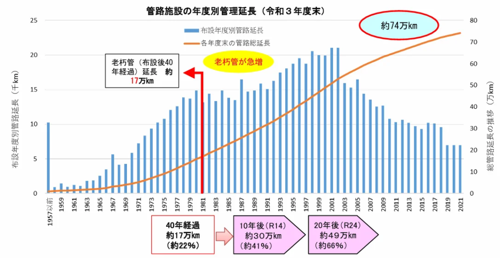 現在、全国の水道管の総延長は約74万km、多くは昭和30~40年代の高度経済成長期に整備されたもので、法定耐用年数40年を経過した管路の延長は約17.6万km(総延長の約23.6%)、さらに2040年には約49万km(約66%)と今後急増していくと言われている。水道管の老朽化により日本全国で年間2万件を超える漏水・破損事故が発生し、濁水や断水、健康被害、災害時の被害拡大など、さまざまなリスクをもたらしている。しかし、更新率は年間わずか約0.64%と低く、すべての水道管を更新するには130年以上かかる想定となっている。