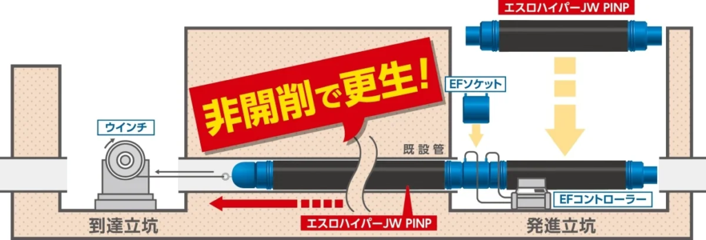 発進立坑内で既設管内に「エスロハイパーJW PINP」を挿入、到達立坑からウインチで挿入管を牽引することで、非開削での更生を実現