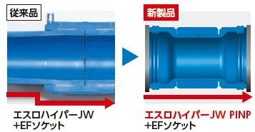 パイプの接合部が縮径しているため、EFソケットの外径と管外径がフラットに。 通常のEF接合で更生管が既設管内にスムーズに挿入でき、1サイズダウンでの更生が可能