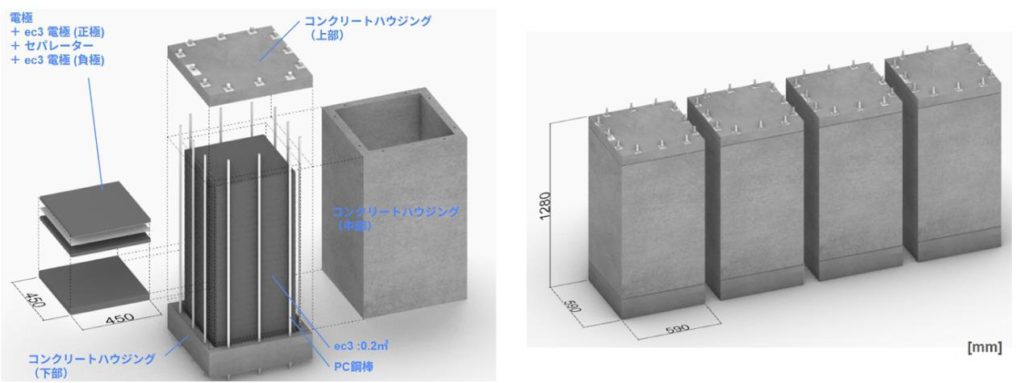 標準蓄電モジュールは、コンクリートに炭素微粒子であるカーボンブラックを添加して電子伝導性を付与し、電極として機能させたコンクリートを用いたスーパーキャパシタ。45cm角の2枚の電極の間に電解液を含浸させたセパレーターを挟み込むことで約1Vのセルを形成し、このセルを25層積層することで約25Vを発生するユニットとなる。さらにセパレーターを湿潤状態に保つため、コンクリートハウジングで封止し密閉状態を維持する。これらのユニットを4基接続することで100V級の出力を持つモジュールを構築することが可能であり、世界で初めて1m3スケールで構築された蓄電コンクリート標準モジュールとなる。