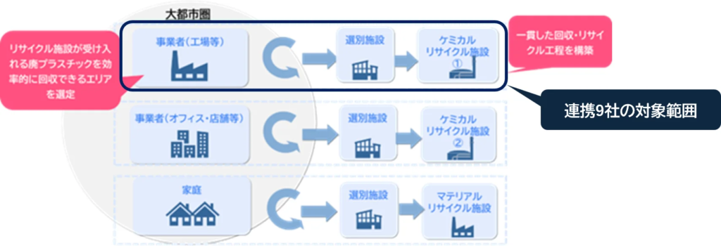 本実証事業のうち、連携9社は、「大都市圏」において、工場から排出される廃プラスチックを対象に、分別・回収からケミカルリサイクル、再生材製造に至るまでの一貫したサプライチェーンの実証を行う。各社の専門領域を活かし、大都市圏における効率的かつ高品質な資源循環モデルの構築を目指す。各社の<主な役割>、概要・活動内容は以下の通り。