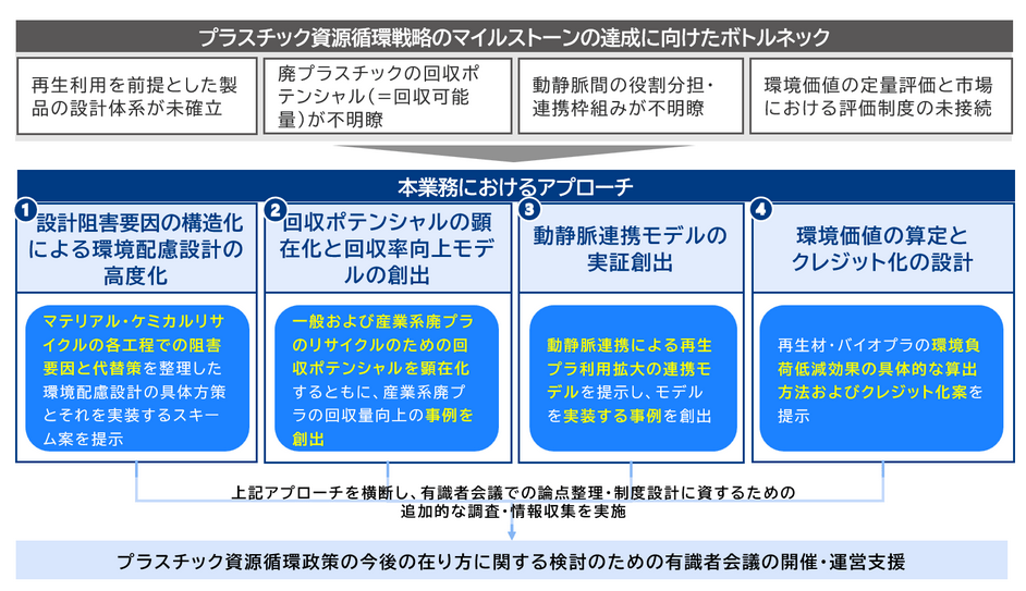 同業務では、プラスチック資源循環に関する国内外の動向や企業・自治体等の取り組みを調査・分析するとともに、有識者会議の開催を通じて資源循環戦略の実現に資する政策を検討する。