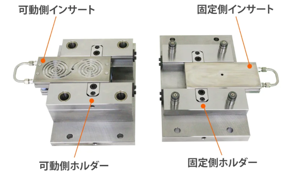カセット式樹脂試験金型は、金型ホルダーを射出成形機に常時取り付けたまま、固定側・可動側のカセット式インサート(以下、インサート)のみを容易に交換できる構造を採用している。これにより、試験片ごとに金型一式を載せ替える必要がなくなり、段取り時間を大幅に削減できる。また、インサートを用意するだけで多種多様な試験片に対応できるため、従来の金型製作コストを抑えられるだけでなく、金型保管の省スペース化にも大きく貢献する。