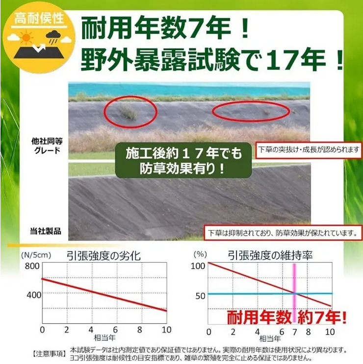 野外暴露試験の結果では17年以上の耐用年数を誇るが、紫外線を遮断する砂利下に施工した場合、さらに長期的な効果が持続期待され面倒なメンテナンス作業が軽減されり。