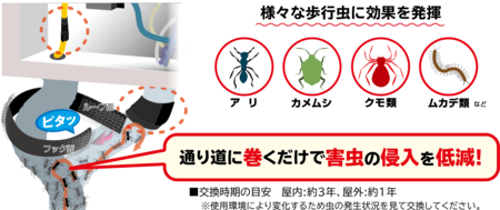 通り道に巻くだけで、害虫の侵入を低減できる、防虫機能が付いたグリップタイ。